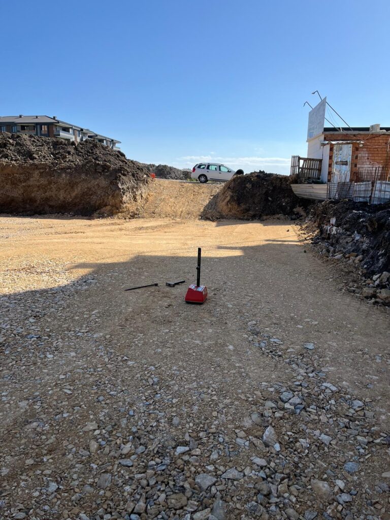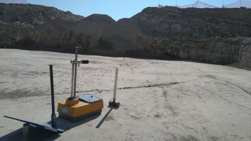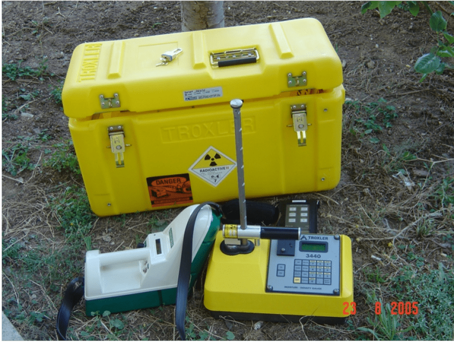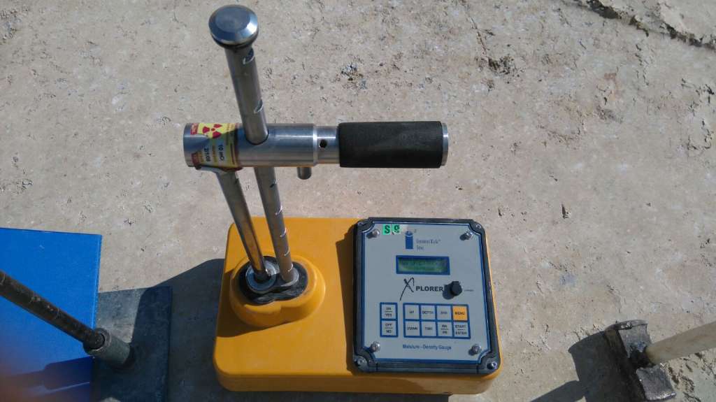 - Nükleer Proktor testi cihazına Laboratuvardan alınan max. Kuru birim hacim ağırlığı değeri girilir. Aşağıda videoda görüldüğü gibi sıkışmış zeminde murç yardımı ile delik açılır. Açılan deliğe cihazın probu yerleştirilir ve sıkışma değeri ve su muhtevası ölçülür.